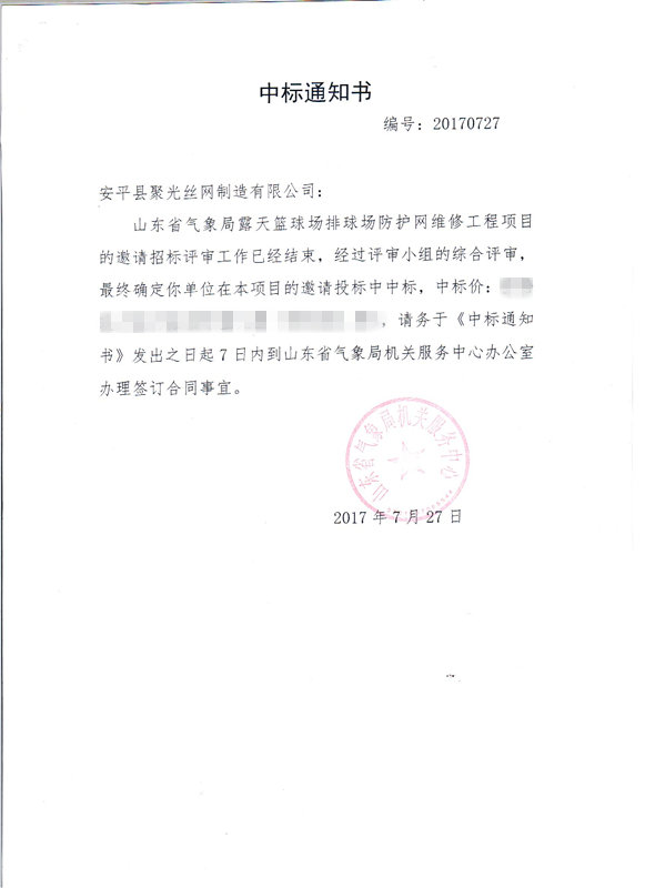 热烈祝贺2017年7月27日“山东省气象局露天篮球场排球场防护网工程项目”由我公司中标,该项目为体育场护栏,我们将一如既往,保质、保量、按时完成此工程。