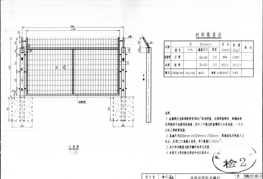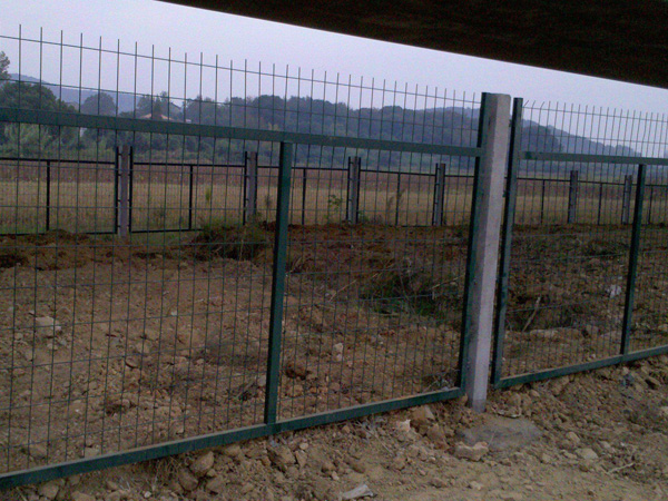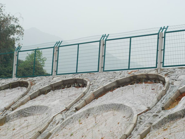 铁路护栏网片经防腐处理:经除锈、打磨、钝化、硫化等工艺后,采用浸塑处理,颜色为草绿色,塑层厚度为0.6~0.8mm,塑粉采用抗老化性能较佳的进口耐候性树脂粉料,塑层必须颜色一致,表面光滑,不允许有流挂、滴瘤或多余结块。