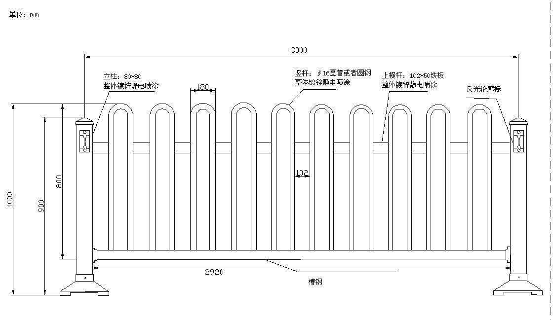 阻拦功能:交通护栏将阻拦不良的交通行为,阻拦试图横穿马路的行人或自行车或机动车辆。它要求护栏有一定的高度,一定的密度(指竖栏),还要有一定的强度。
